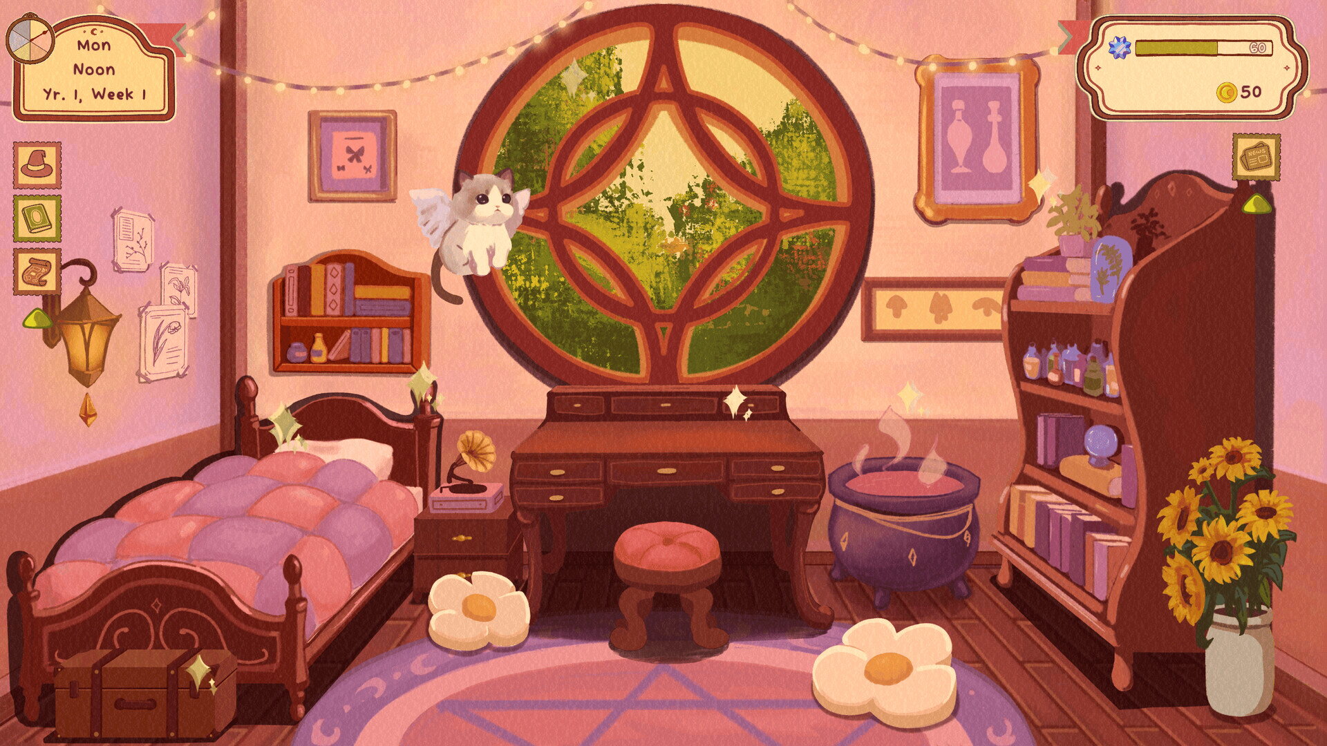 Your wages can be exchanged for a sweet treat in the dining hall, a new book downtown, or accessories for your dorm, including a record player and a cauldron. If you have a particular specialty–such as potion-making or painting–try selling your wares to fund future projects. As you work, however, be mindful of your energy level; you can take a rest in your dorm when needed.